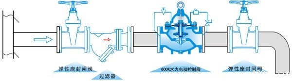 600X水力电动控阀由主阀、电磁导阀、针阀、球阀、微形过滤器和压力表组成水力控制接管系统。通过电磁导阀可以实现对阀门开启和关闭的遥控。加装附加装置后,可控制开启和关闭的速度。